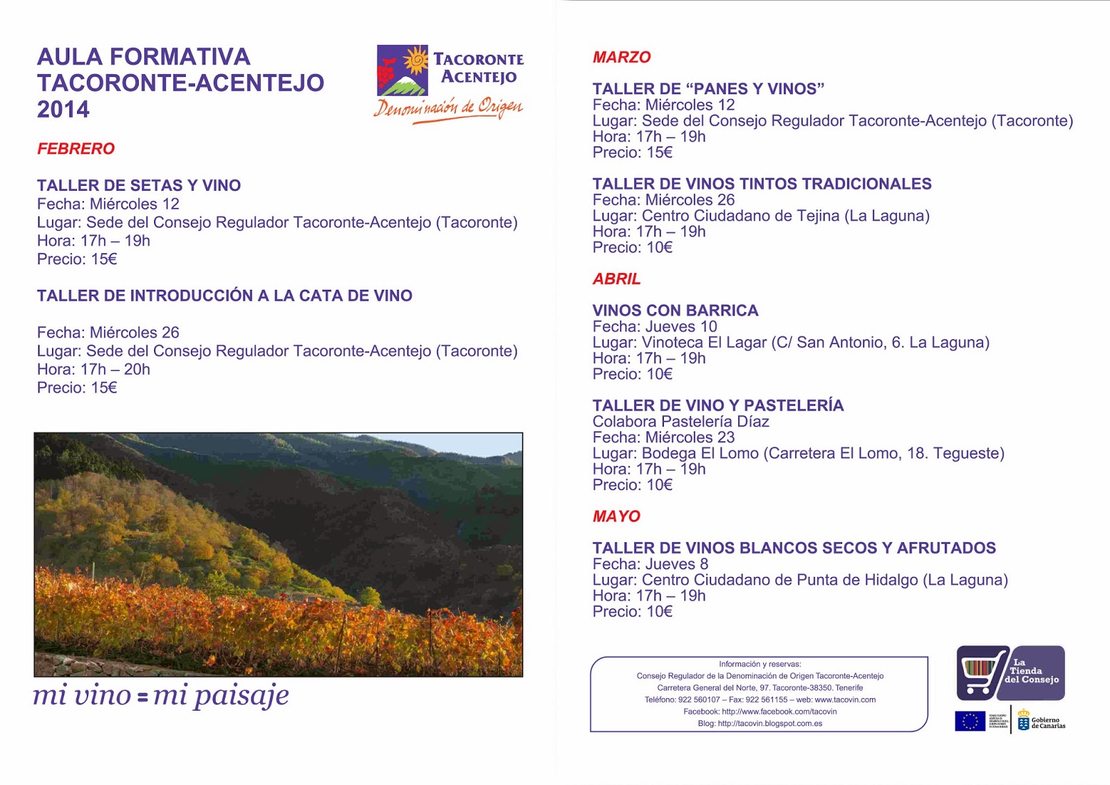 Con el comienzo de año, vuelve el aula de formación del ConsejoRegulador de la D.O. Tacoronte-Acentejo. Las propuestas de este nuevo curso son variadas y se desarrollan a lo largo de la comarca, concretamente en Tacoronte, Tegueste y La Laguna (Tejina, Punta del Hidalgo y centro ciudad); el mismo integra las actividades siguientes: curso de iniciación a la cata de vinos (Tacoronte), taller de vinos con barrica (La Laguna centro), taller de vinos tintos tradicionales (La Laguna, Tejina), taller de vinos blancos secos y afrutados (La Laguna, Punta del Hidalgo); junto a propuestas que incitan al maridaje como el taller de setas y vinos (Tacoronte), taller de pan y vino (Tacoronte) y el taller de vino y pastelería (Tegueste).