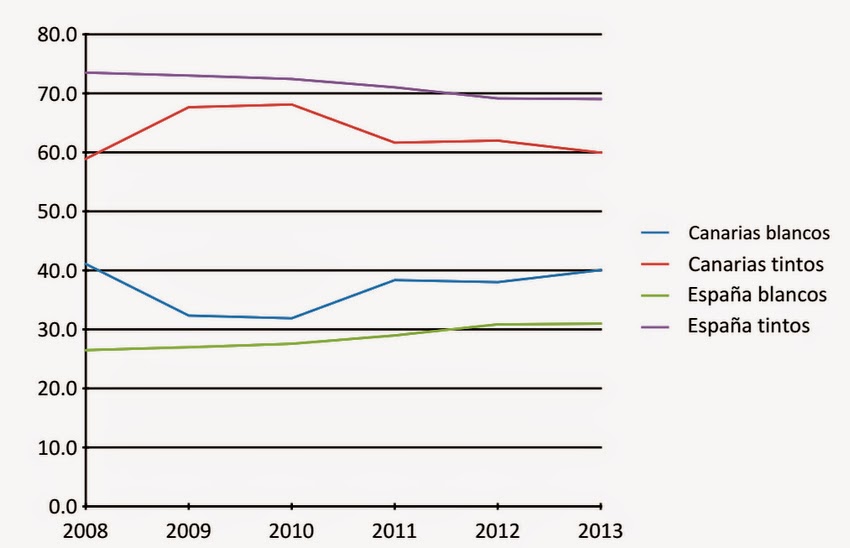 Vamos con la primera pregunta: ¿Es cierto que los blancos ganan cuota de mercado?, ¿también en Canarias? Los datos del Panel de Consumo de Alimentos del Ministerio de Agricultura, Alimentación y Medio Ambiente indican para los años 2008 a 2013 la siguiente evolución. Para el conjunto de España se confirma que el peso de los blancos ha ido creciendo (ver gráfico); en 2008 sólo suponen el 26,5% de la suma de blancos y tintos, en 2013 ya alcanzan el 31,0%. En Canarias, los respectivos porcentajes son del 41,1% y 40,0%. Por lo tanto, el peso de los blancos en Canarias es mayor que en el conjunto de España -esto no es novedad-, pero esta participación no crece. No obstante, sí es cierto que primero bajan hasta el 31,9% en 2010 y luego vuelven a subir al 40% en 2013.