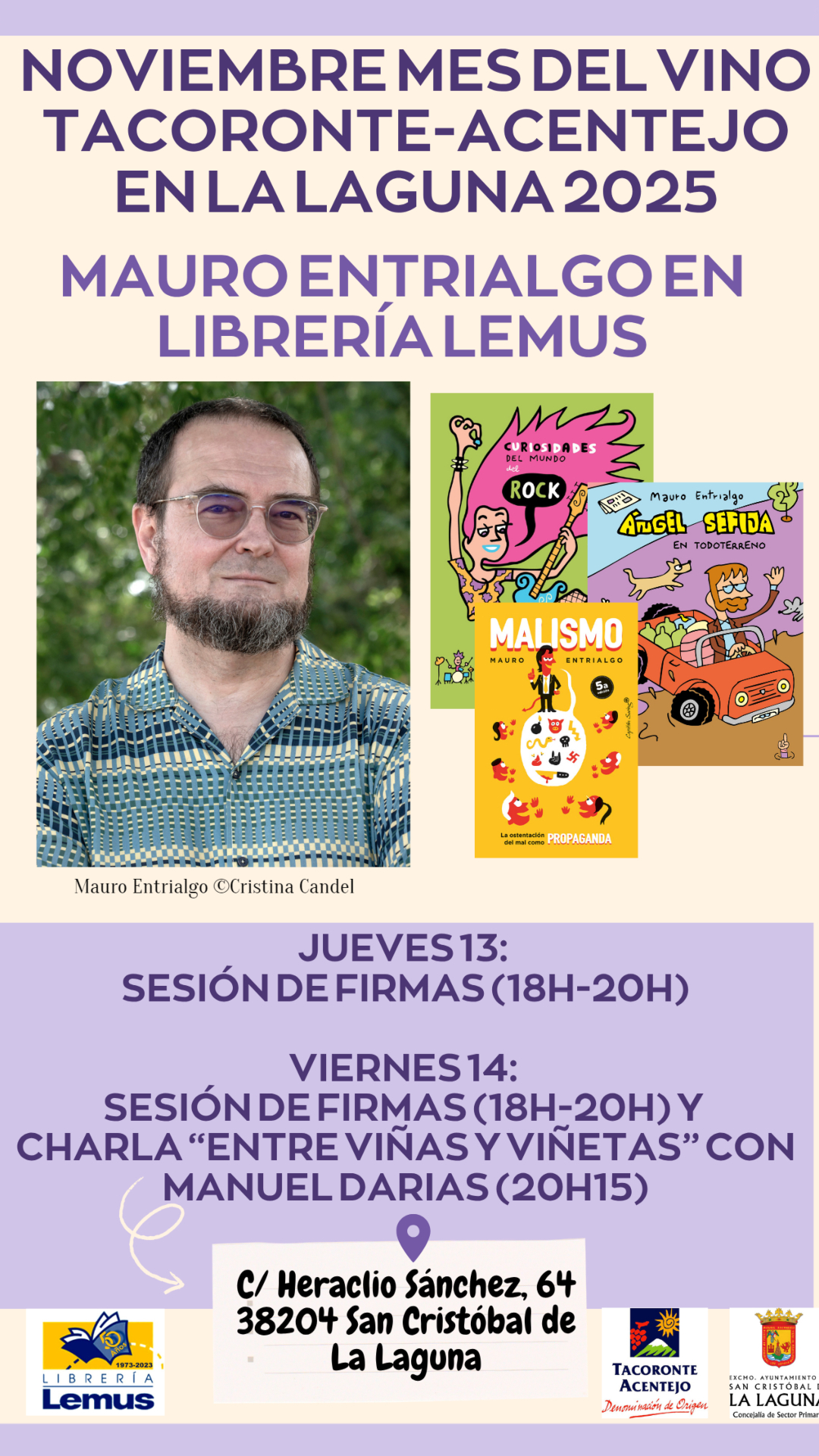 Mauro Entrialgo es el historietista invitado en la nueva edición del programa “Noviembre Mes del Vino Tacoronte-Acentejo en La Laguna” gracias a la colaboración entre la D.O. Tacoronte-Acentejo, Librería Lemus y el Ayuntamiento de La Laguna. El historietista firmará ejemplares de su obra los días 13 y 14 de noviembre de 2025 en librería Lemus en horario de 18h a 20h. El mismo viernes 14, a las 20h15 participará en el encuentro “Entre Viñas y Viñetas” junto
